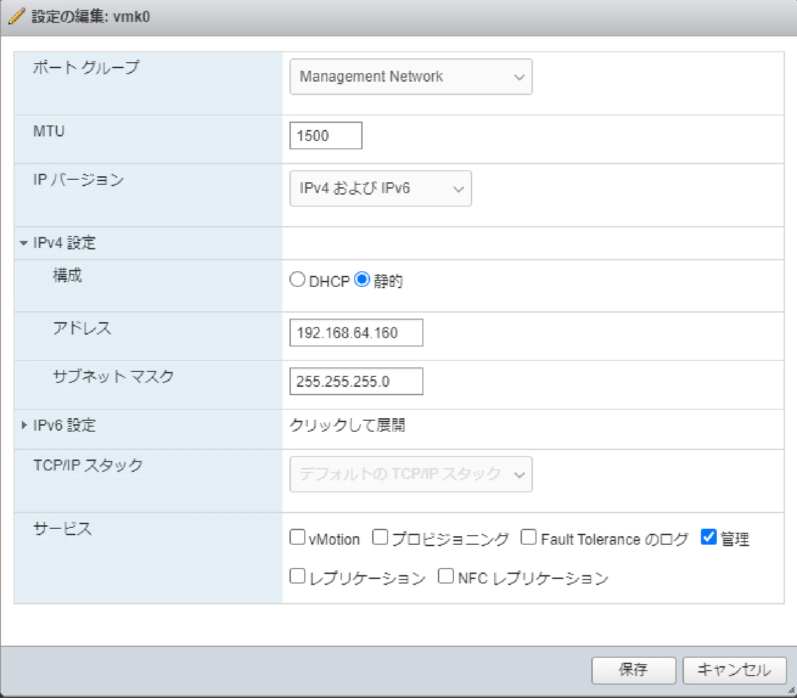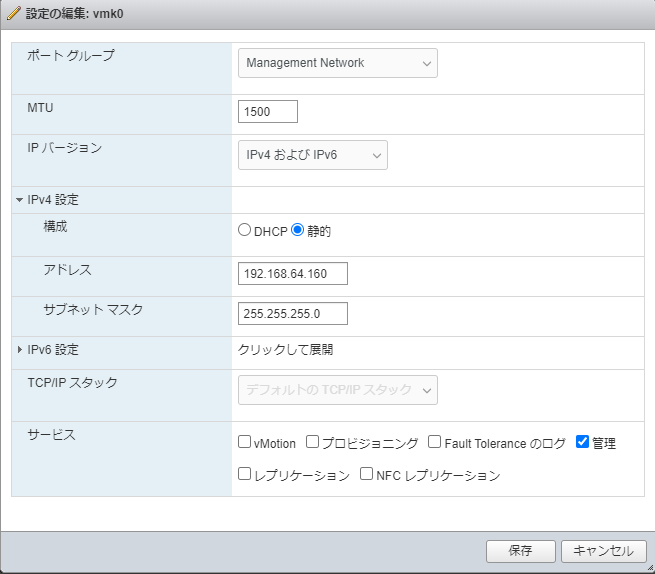 任意のIPアドレス、サブネットマスクを入力した後「保存」をクリックすることで指定したIPアドレスがESXiで使用されるようになります。