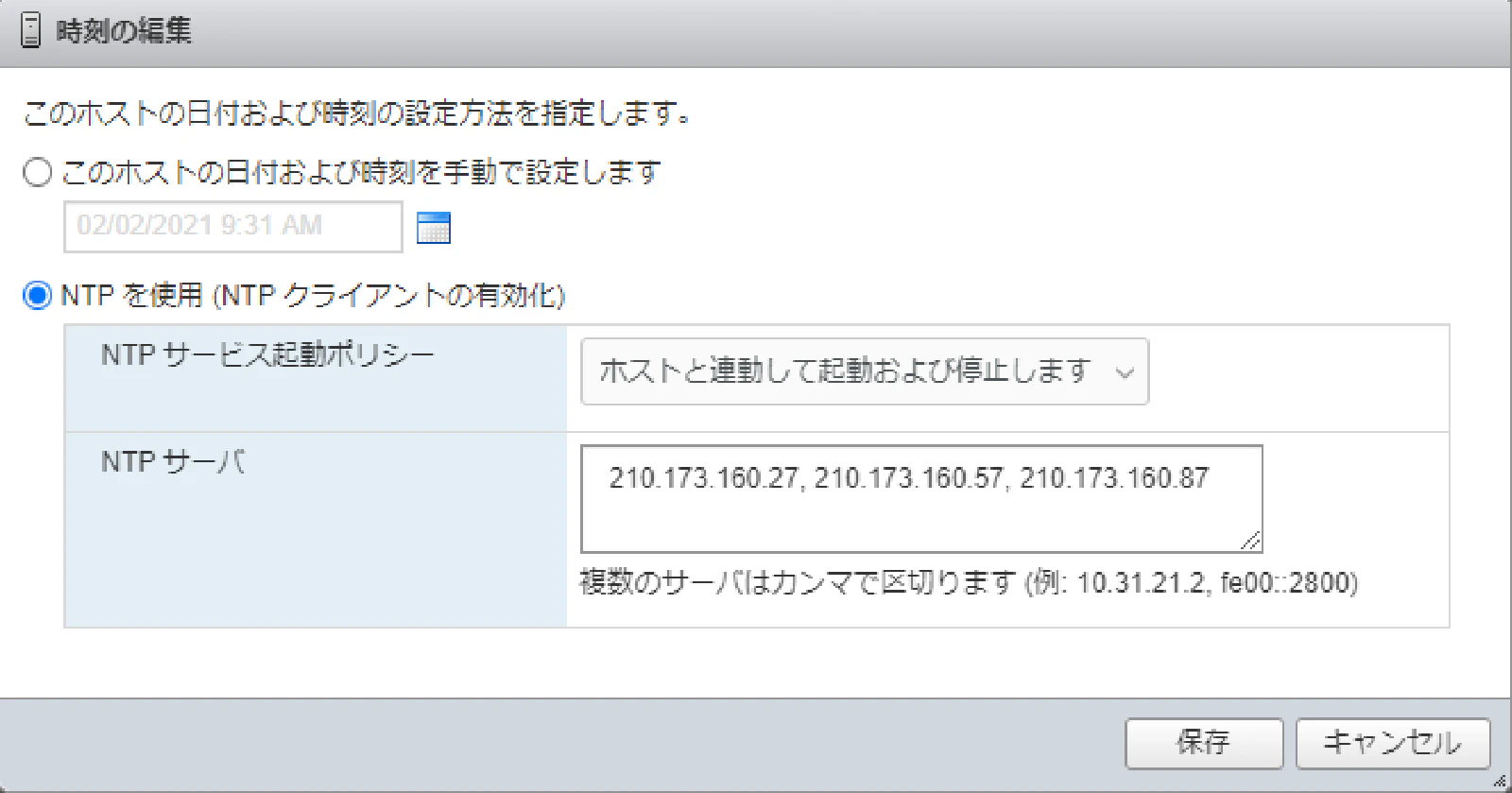 ナビゲーター→ホスト→管理→システム→日付と時刻からNTPサーバーの指定を行い、サービスが自動起動するように設定します。