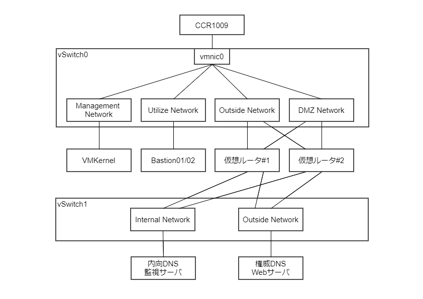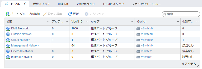 なお、アップリンクとなる物理NICが1ポートしかないため、各ポートグループ毎にVLANを設定することになります。