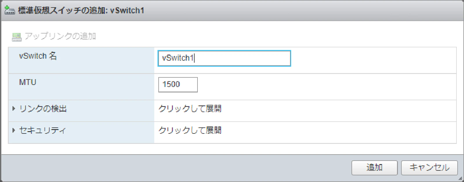 “vSwitch名"に適当なvSwitch名を入力して「追加」をクリックすることでvSwitchが作成されます。