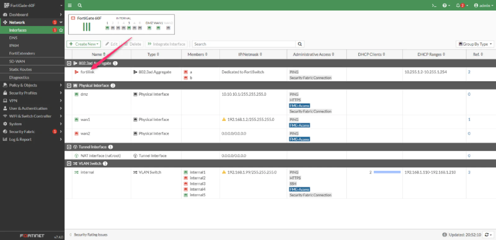 初期状態のForitGate 60Fでは、aポートとbポートがFortiLinkポートとして設定されています。