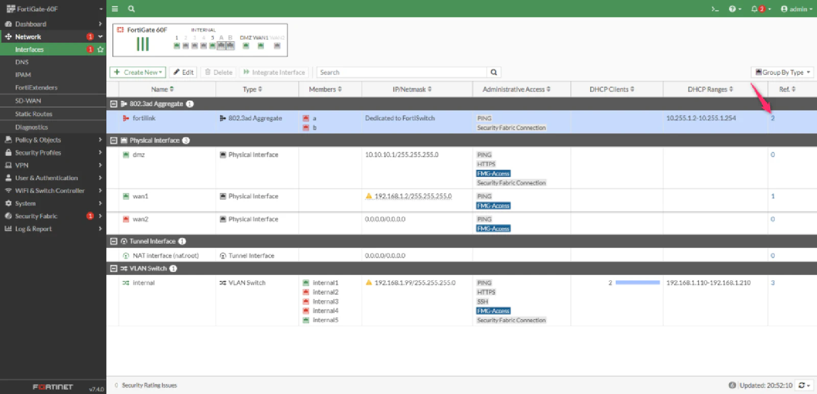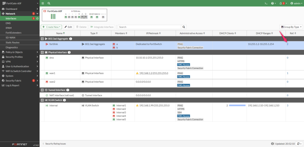 まずは、FortiLinkポートが参照されている箇所を確認します。