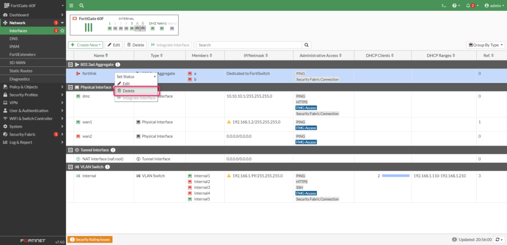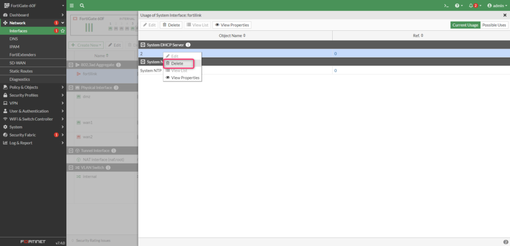 Interfacesに戻って fortilink のコンテキストメニューからDeleteで削除することができます。