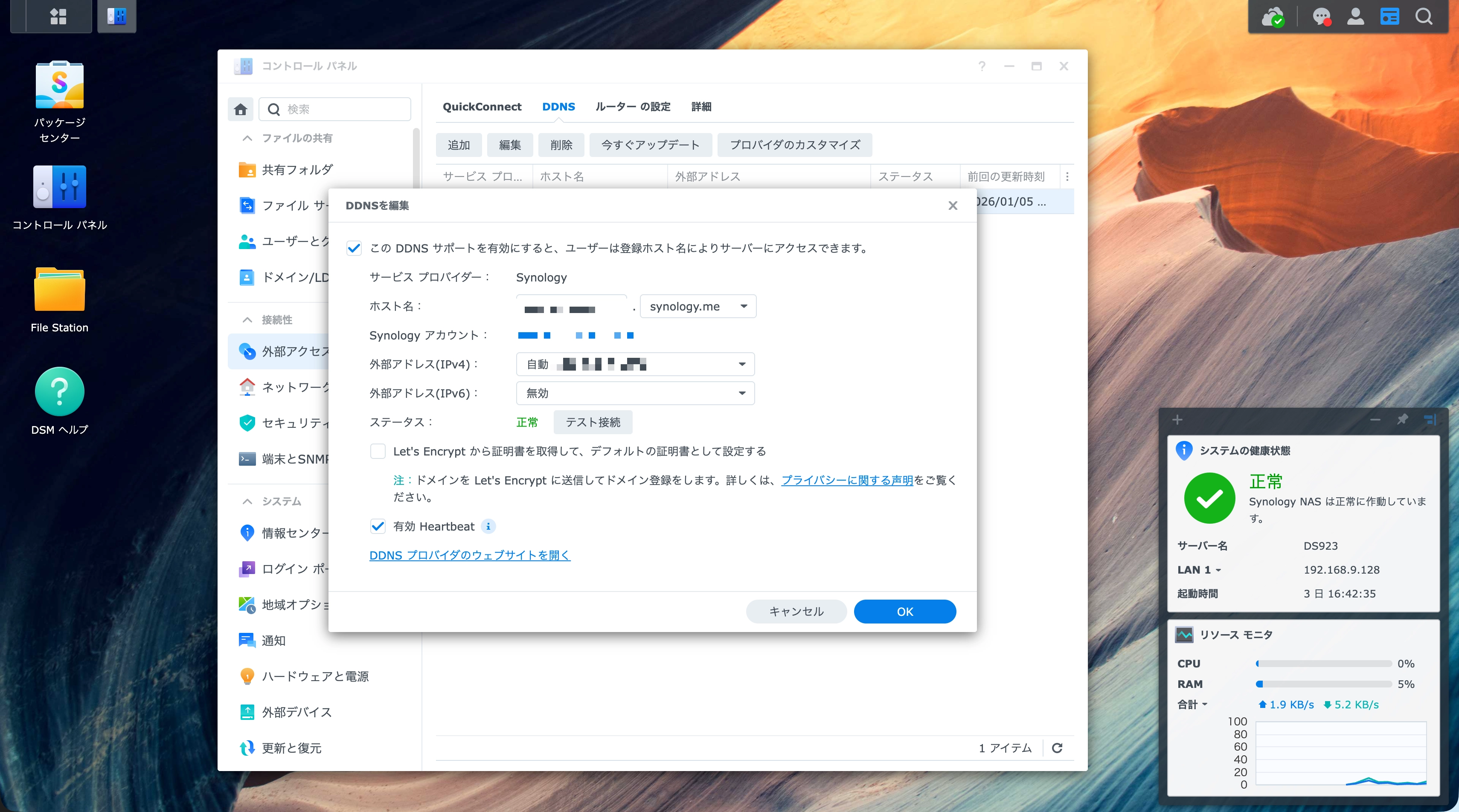 - 「コントロールパネル」→「外部アクセス」→「DDNS」タブを開く