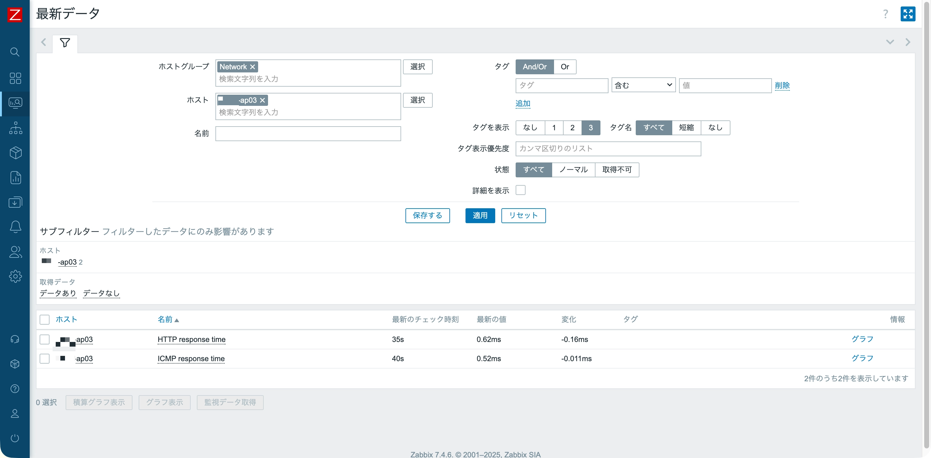 設定後、しばらく待つとデータの取得が始まります。 Zabbixの「最新データ」画面で、PingとHTTPの応答時間が表示されるようになります。