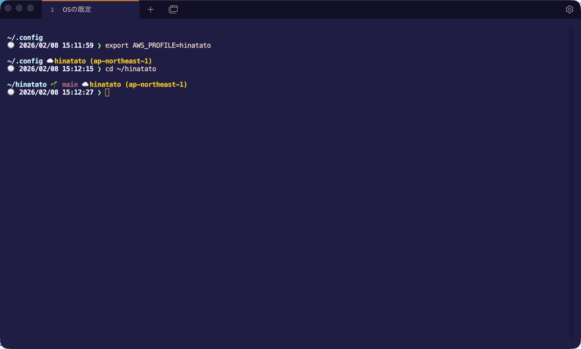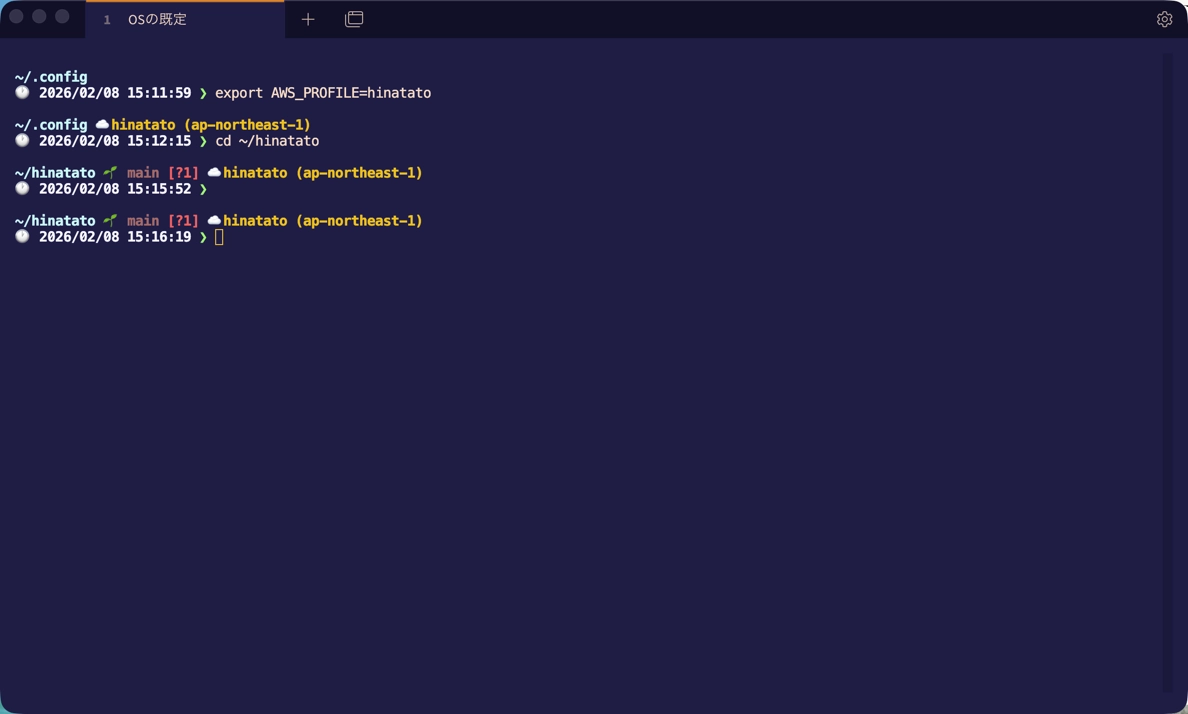 AWSの表示 複数のプロファイルを使い分けているので、今どのプロファイルで作業しているか一目で分かるのは安心感があります。特に本番環境のプロファイルを使っているときは、視覚的に分かりやすくなって良かったです。