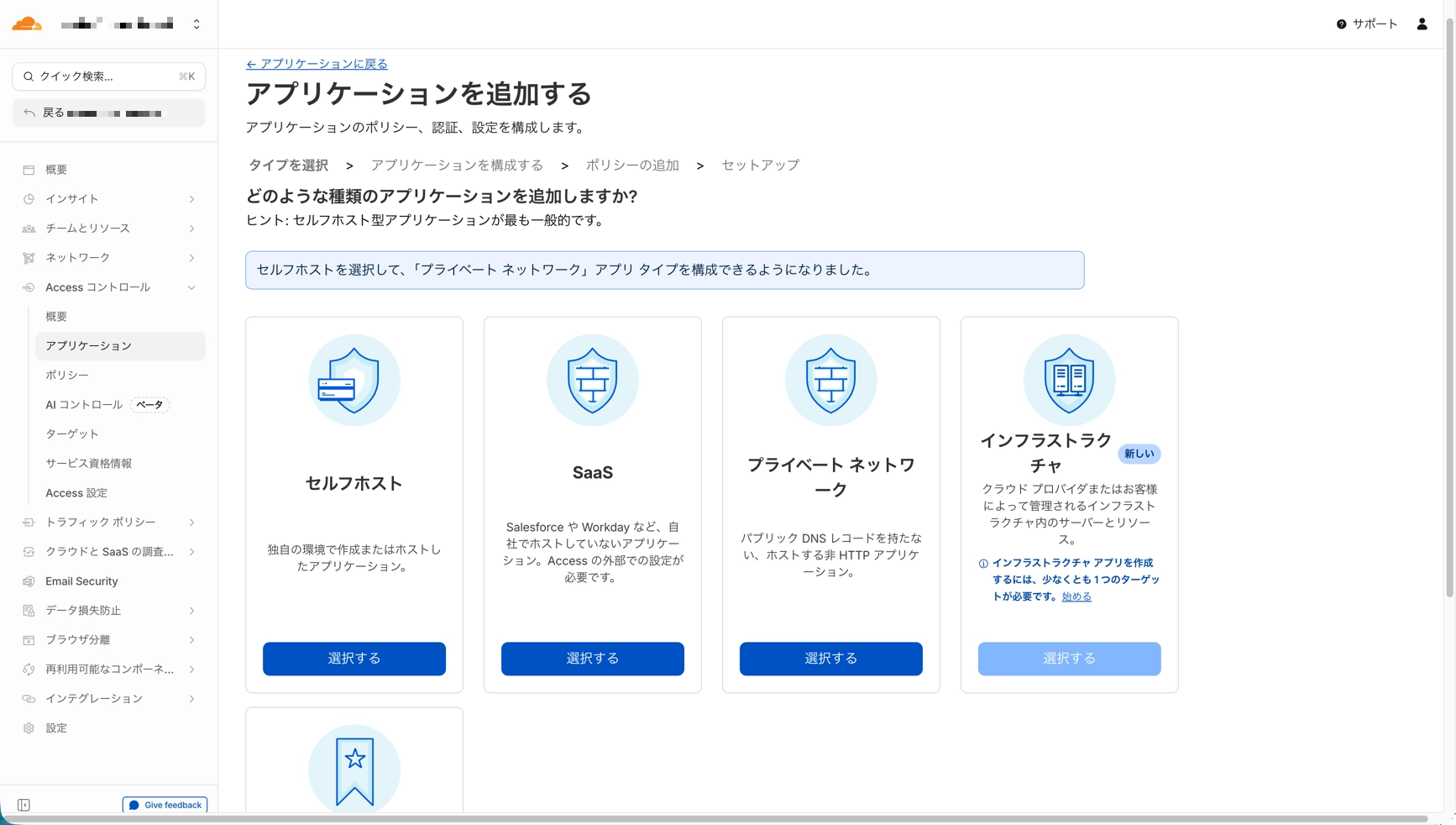 Zabbixなど他のサービスにも同様にAccessアプリケーションを作成します。 Policyは使い回せるので、同じルールを適用する場合は既存のPolicyを選択するだけで済みます。