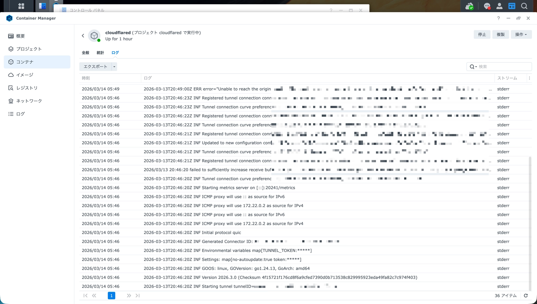 cloudflaredコンテナのログを確認してください。 DS224+からCloudflareへのアウトバウンドHTTPS(443)通信がブロックされていないか確認します。 環境によってはポート7844(QUIC)への接続も必要です。