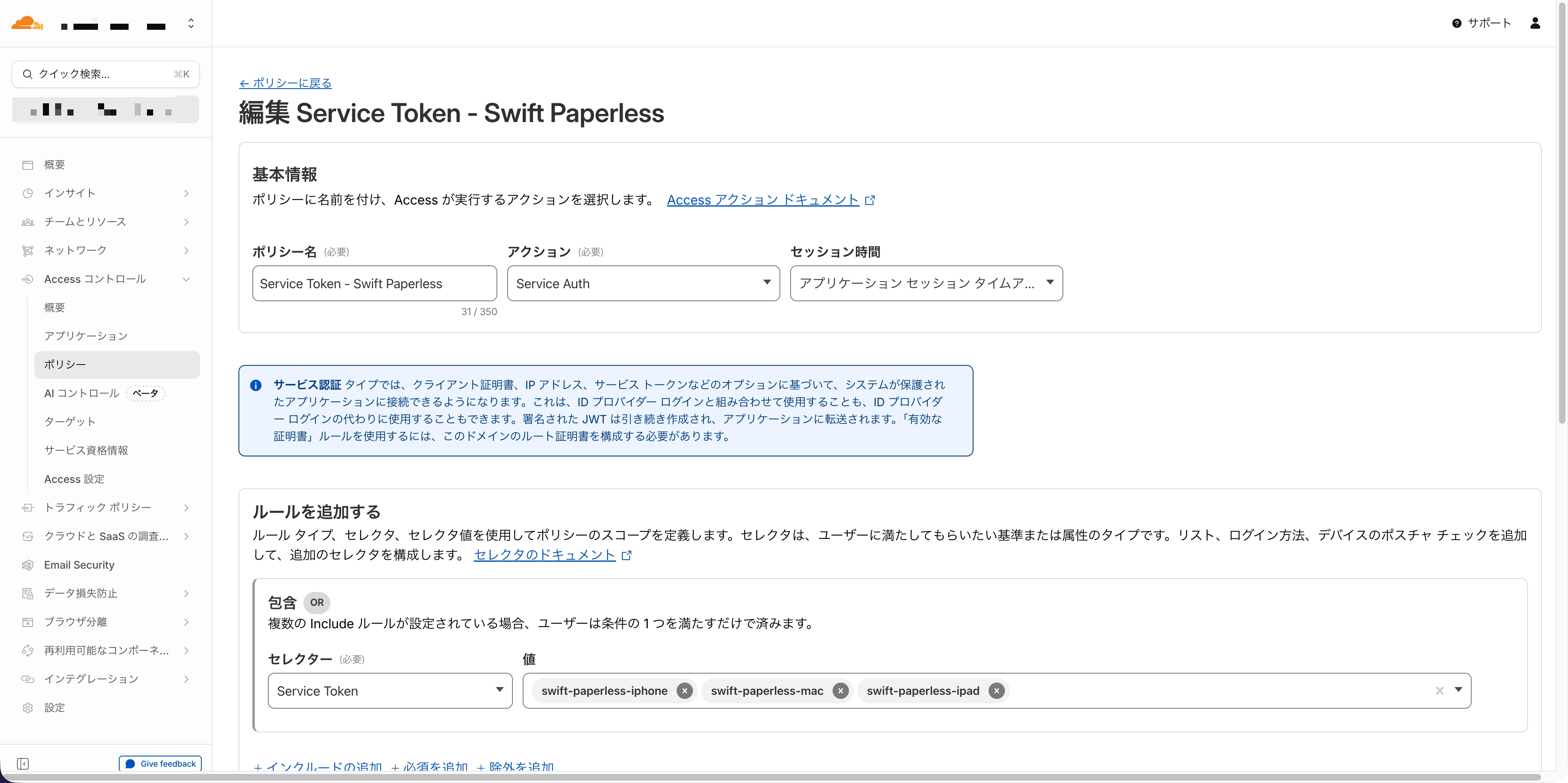 外出先からもCloudflare Tunnel経由でアクセスできるよう、Service Tokenを使ったバイパス設定を行いました。