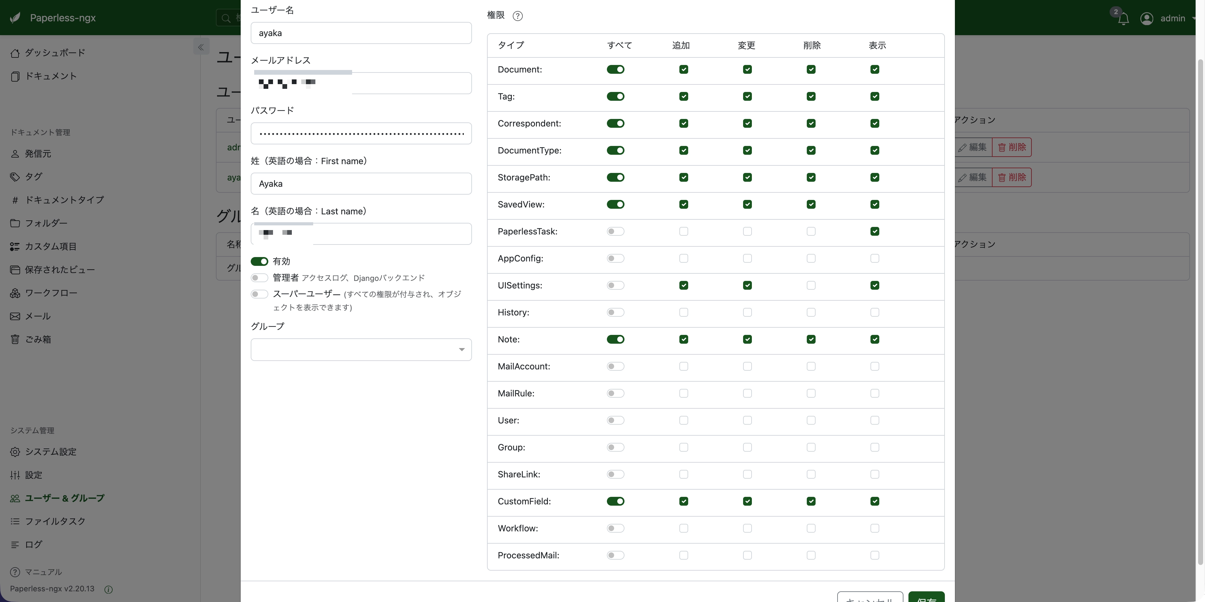 DSMのコントロールパネル > ユーザーとグループで、Paperless-ngx用のユーザー paperless を作成しました。docker 共有フォルダへの読み書き権限を付与しています。
